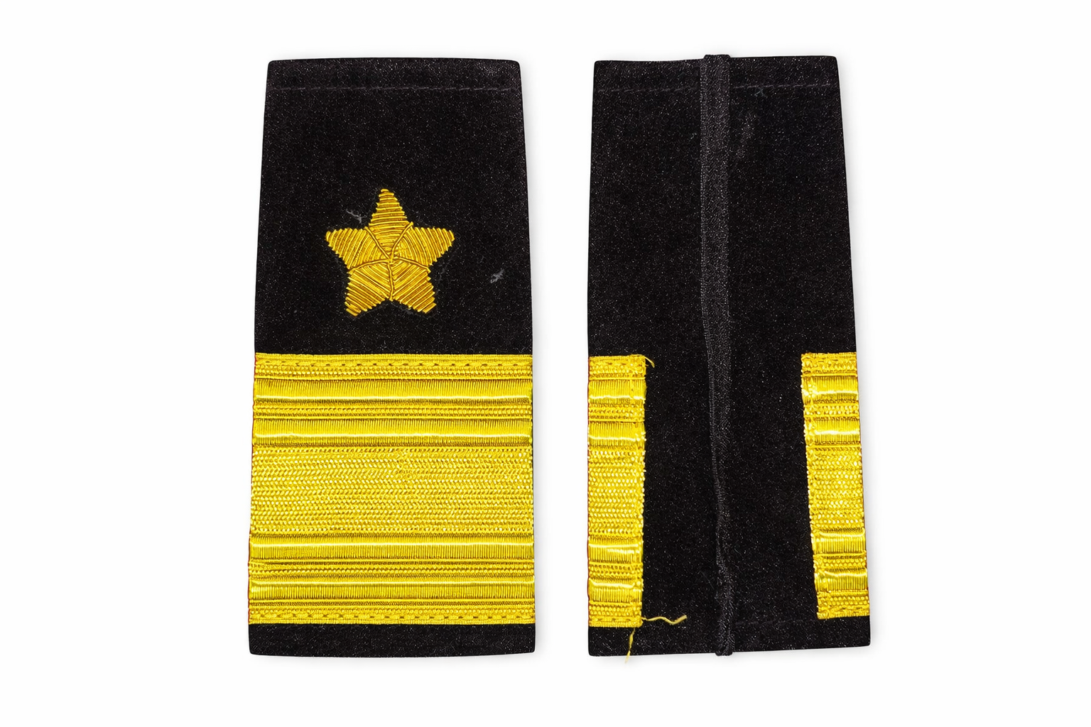 - Black fabric with gold-colored trim and bullion wire star embroidery