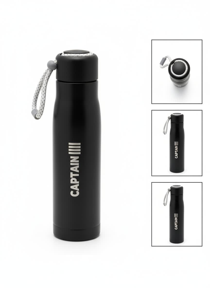 Black stainless steel bottle with “CAPTAIN” print and three stripes. Comes with a rope handle, leak-proof lid, and keeps drinks hot or cold for long hours. Stylish, strong, and easy to carry.