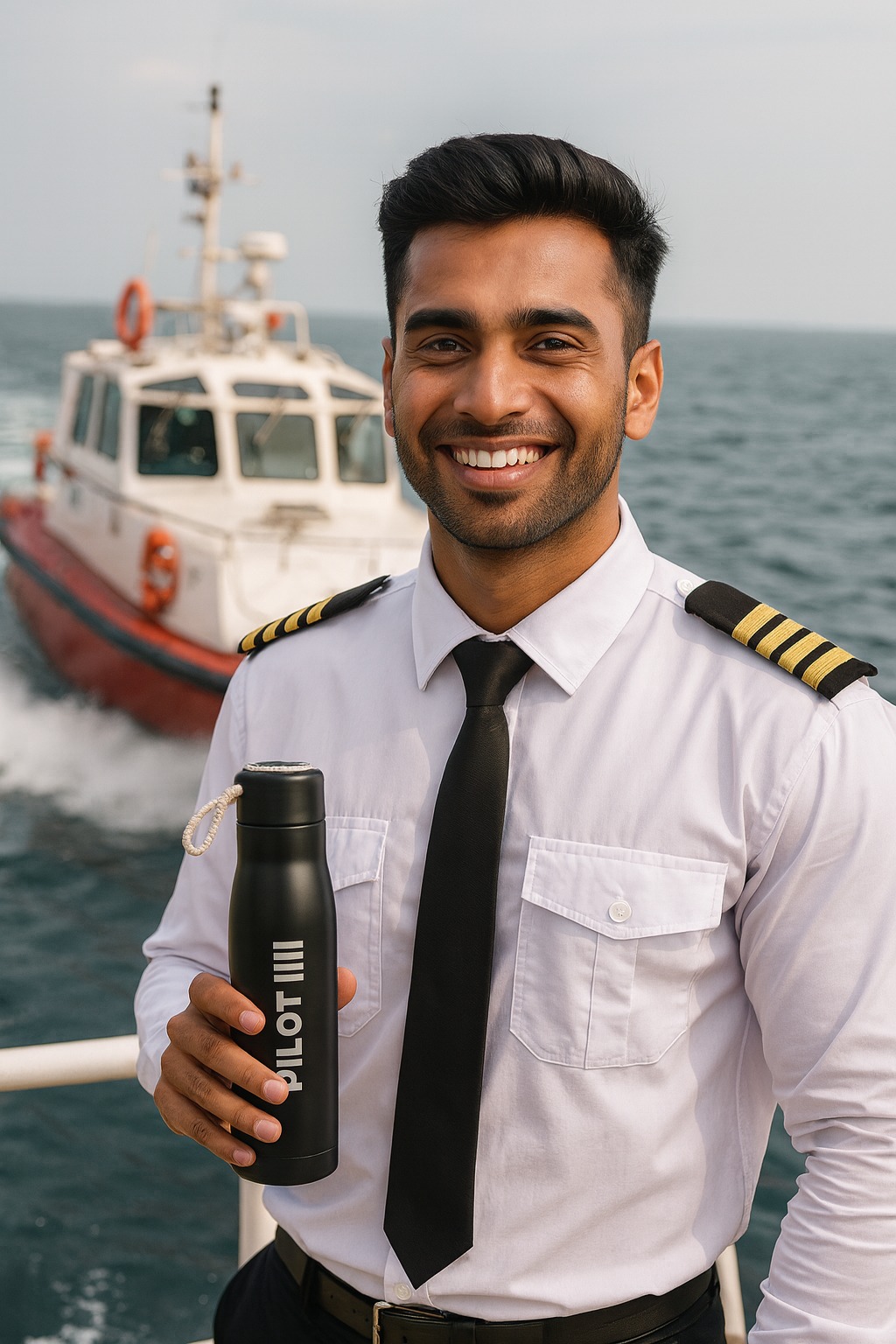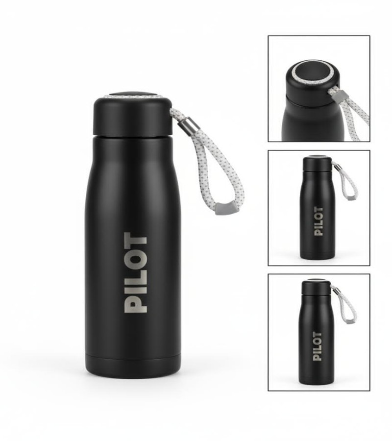 Black stainless steel bottle with “PILOT” print and three stripes. Comes with a rope handle, leak-proof lid, and keeps drinks hot or cold for long hours. Stylish, strong, and easy to carry.